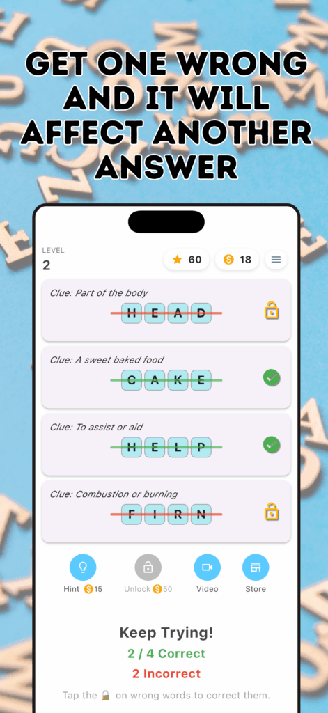 A brain-teasing twist on classic word games – solve carefully or get stuck with the wrong letters!